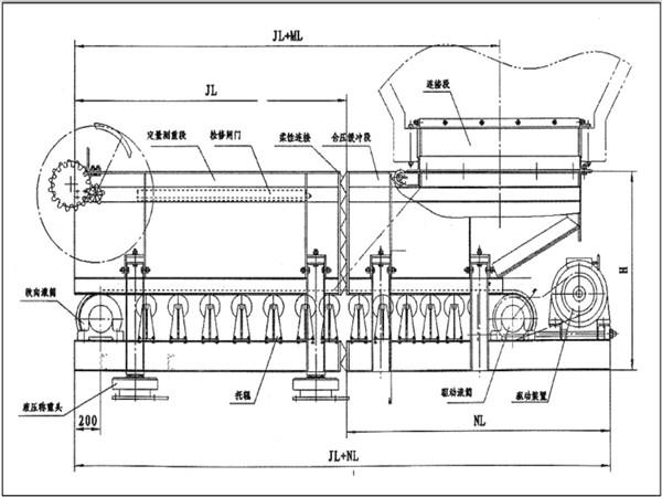 2、定量測(cè)重段:豎直方向處于浮動(dòng)狀態(tài),通過(guò)四個(gè)ZZT系列液壓測(cè)重定量裝置達(dá)到精確稱(chēng)重目的;通過(guò)對(duì)稱(chēng)重信號(hào)處理后反饋BPBT-37/660型礦用隔爆型變頻調(diào)速,達(dá)到恒定給料的目的。